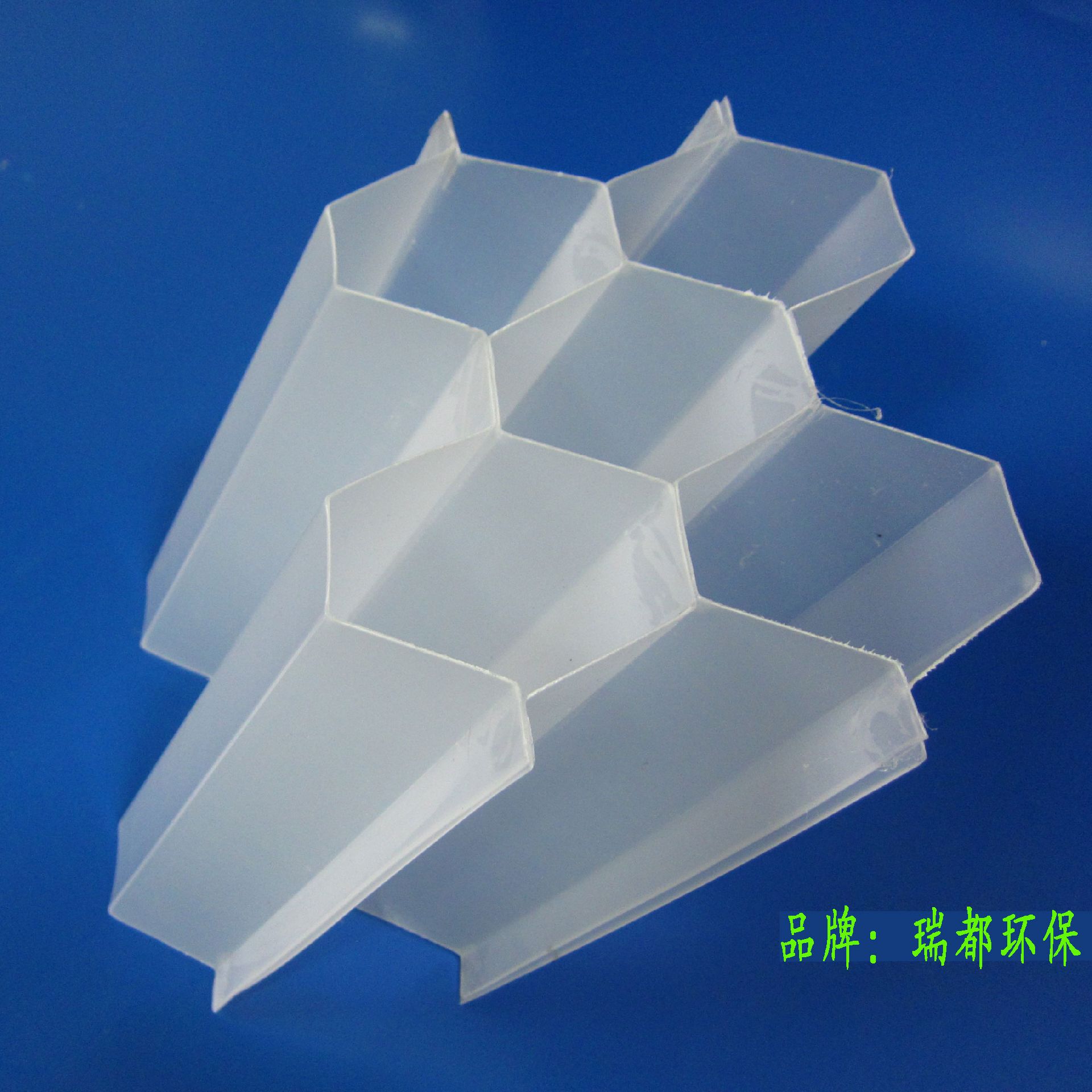 1、打开斜管填料包装,将片斜管填料平放于地面,取第二片斜管填料置于片填料之上,检查斜管填料的切口,必须保证60°角、并呈六角蜂窝状,检查无误后开始烫接粘接点;